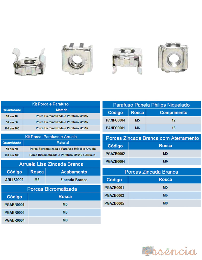 – Porca Gaiolas com rosca M5, M6 e M8.